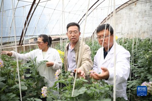 6月9日,甘肃省定西市农业科学研究院的科研人员查看马铃薯开花散粉情况。新华社记者 马希平 摄