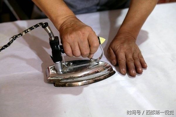 2017年8月12日,甘肃平凉市,55岁民间牛人吴志泰先生正在用熨斗将纸张烫平,这是一道很重要的工序。