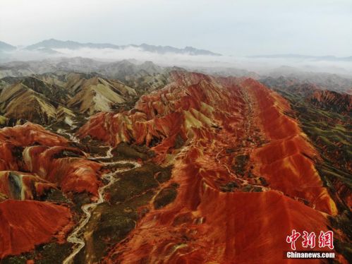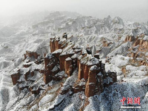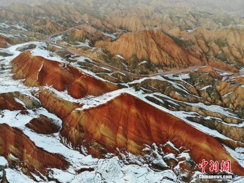 7月9日,甘肃张掖市官方对外发布消息称,张掖地质公园获批联合国教科文组织“世界地质公园”称号。继敦煌世界地质公园之后,甘肃再添一处世界地质公园。张掖地质公园位于河西走廊中部,祁连山北麓,总面积1289.71平方千米,由彩色丘陵、冰沟丹霞、中华裕固风情走廊三个景区,九个泉科考区组成。资料图为雪后张掖冰沟丹霞。中新社记者杨艳敏摄