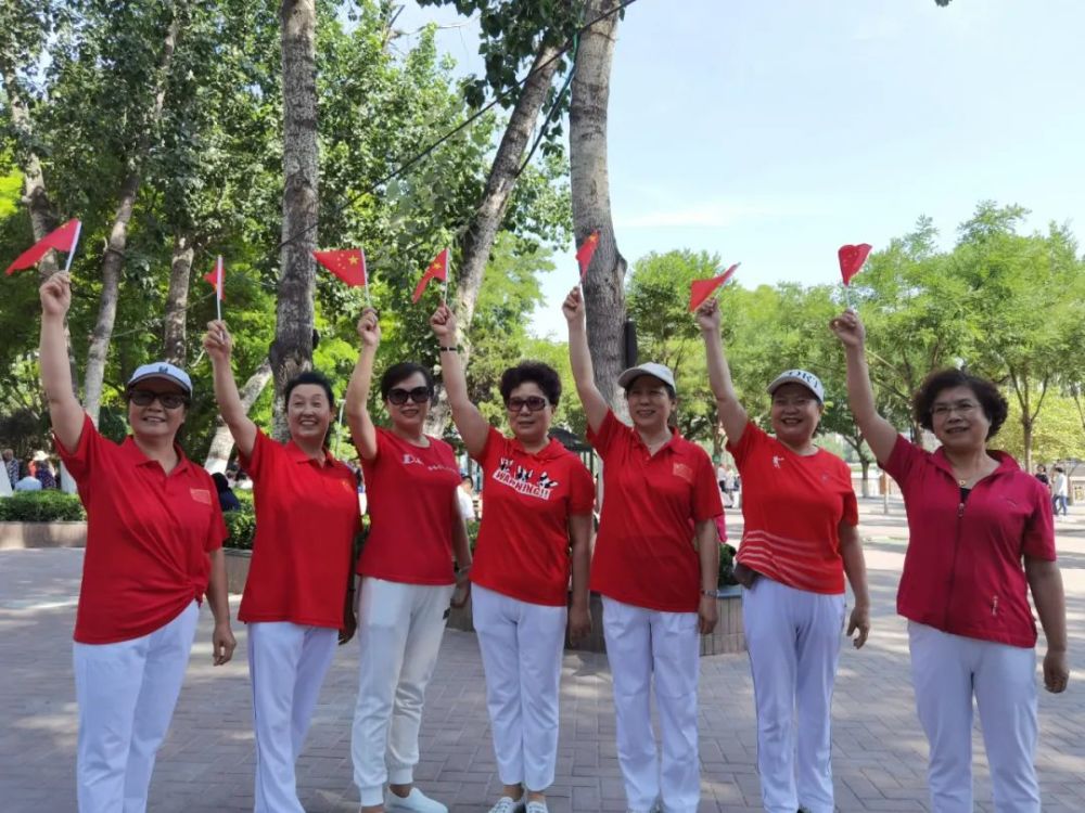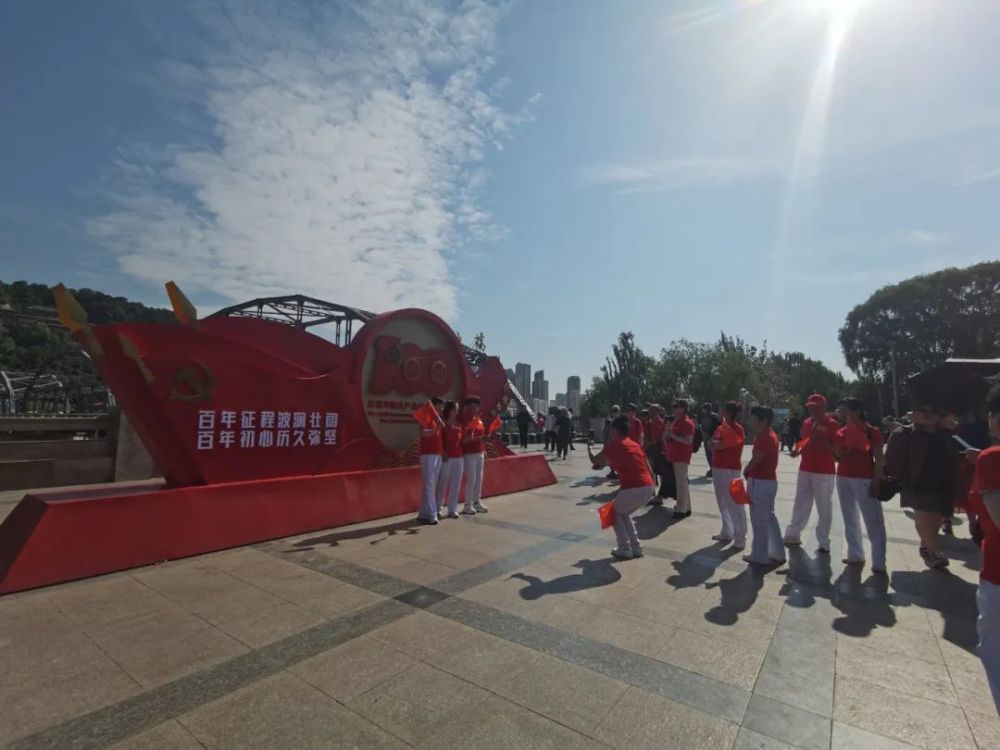 “祝中国共产党生日快乐!”6月23日,在中山桥南广场庆祝中国共产党成立100周年标识打卡点前,一群身着红衣白裤的老年人手握国旗在此合影,并对着镜头喊出自己对党的祝福。