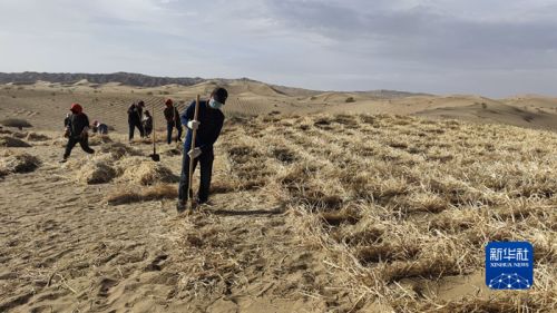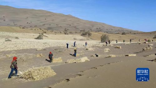 苏家堡村村民正在莫高窟崖顶扎设麦草方格。新华社发(张国彬摄)