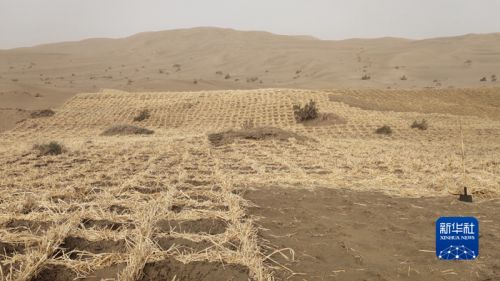 部分扎设完成的麦草方格。新华社发(张国彬摄)