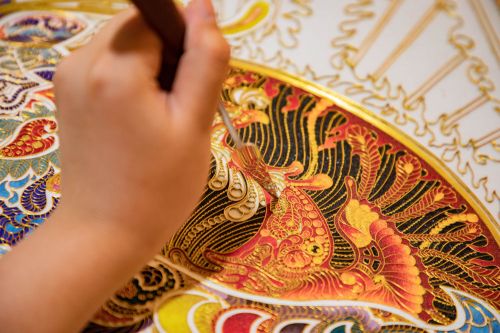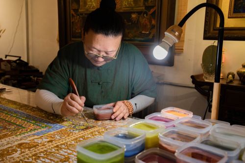 金丝线条勾勒出清晰轮廓,色泽鲜艳的珐琅填充其间……走进位于兰州创意文化产业园的甘肃省掐丝珐琅壁画代表性传承人李海明工作室,花纹繁复的藻井图案、慈眉善目的佛像和灵动的九色鹿等一幅幅充满敦煌元素的掐丝珐琅壁画流光溢彩。