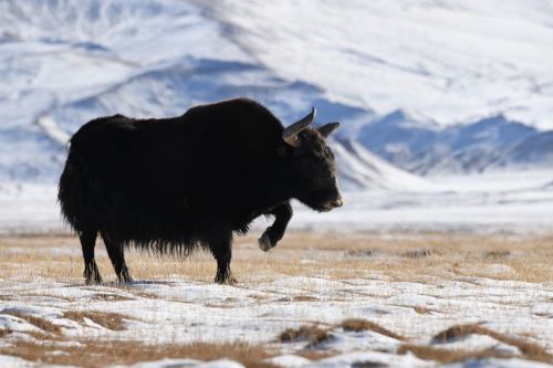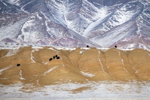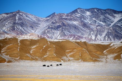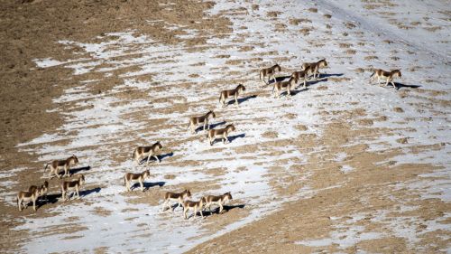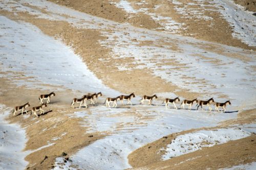一场降雪过后,地处甘肃省酒泉市阿克塞哈萨克族自治县境内的哈尔腾高原被皑皑白雪覆盖,成群的藏野驴、野牦牛等野生动物在高山雪地间戏雪觅食,为冬日的哈尔腾增添了不少生机与活力。
