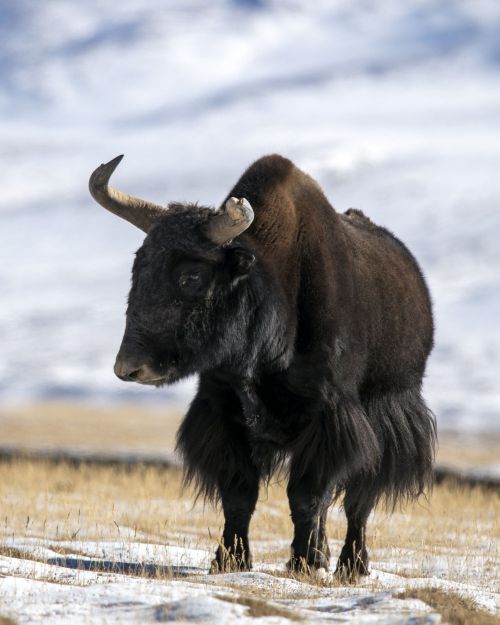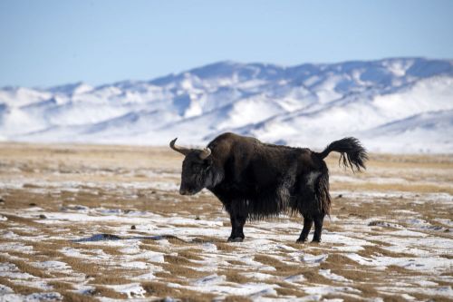 12月17日,野牦牛在哈尔腾高原上活动觅食。新华社发(高宏善摄)