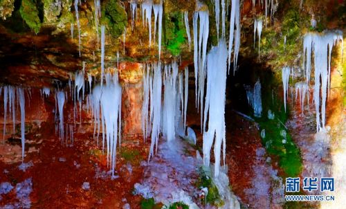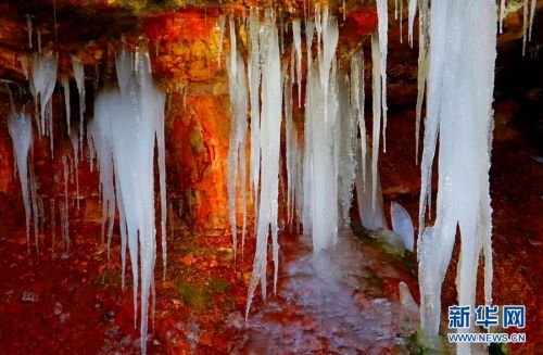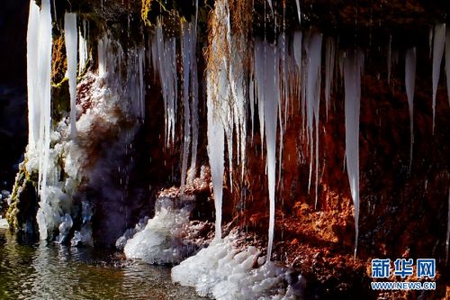 冰挂从崖边垂落。新华网发(张百耀 摄)