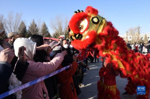 1月30日,在甘肃省阿克塞哈萨克族自治县,社火队员在表演舞狮。 新华社发(高宏善摄)