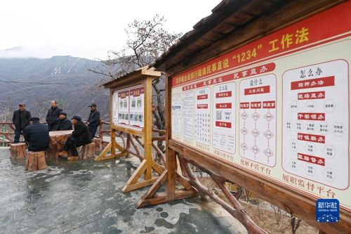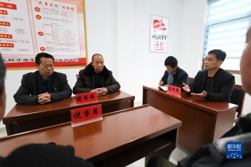在陇南市武都区蒲池乡咀台上村,“民事直说委员会”成员商议群众反映的诉求(2月9日摄)。新华社记者 马希平 摄