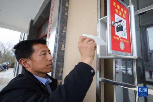 在陇南市徽县银杏树镇高坪村,“民事直说委员会”成员取出“民情民意”收集箱里的群众来信(2月11日摄)。新华社记者 马希平 摄