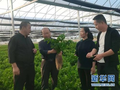 魏自明(左一)同农技专家和农民群众探讨有机芹菜在戈壁农业大棚种植技术。