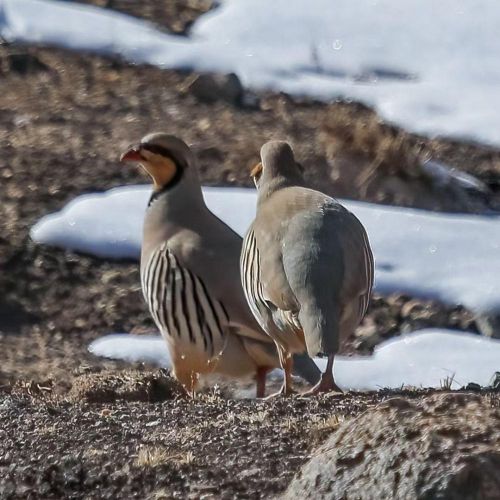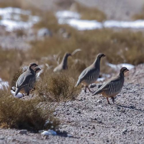 近日,伴着一场春雪渐次消融,在甘肃山丹县红寺湖成群的石鸡窜到山坡悠闲觅食。