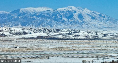 ↑2023年2月14日在甘肃省张掖市民乐县拍摄的祁连山北麓雪景。(无人机照片)CICPHOTO/王将 摄