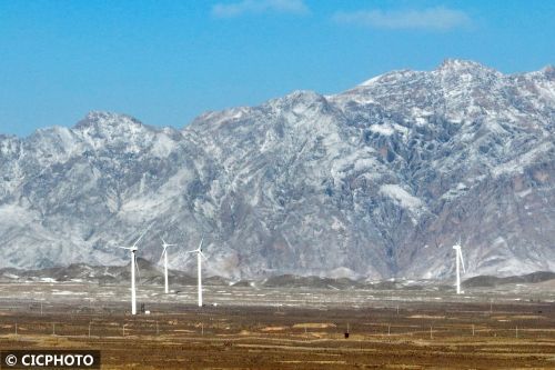 ↑2023年2月18日在宁夏银川市永宁县闽宁镇一处风力发电场拍摄的“贺兰晴雪”美景。(无人机照片)CICPHOTO/袁宏彦 摄