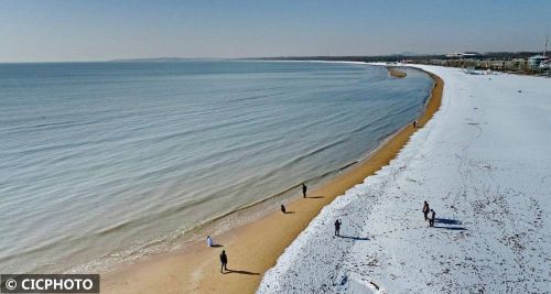 ↑2023年2月19日,人们在河北省秦皇岛市海港区金梦海湾片区赏雪游玩。(无人机照片)CICPHOTO/曹建雄 摄