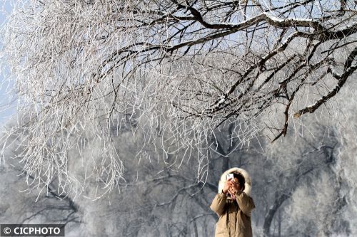 ↑2023年2月19日,辽宁省沈阳市市民在浑河岸边观赏雾凇。CICPHOTO/黄金崑 摄