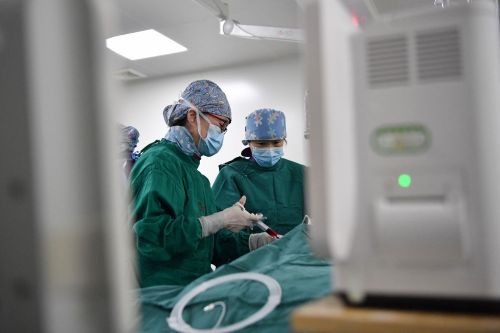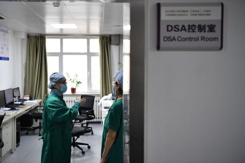 3月7日,马娜(左)和同事在手术室为患者进行介入手术治疗。新华社记者 陈斌 摄