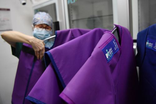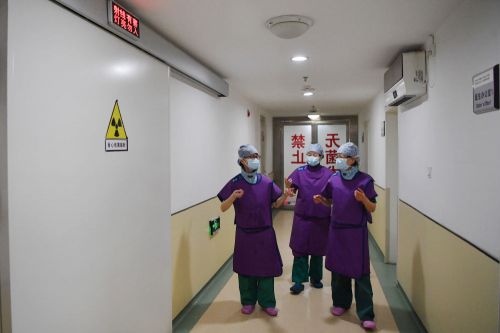 3月6日,穿上铅衣的马娜(左一)和同事准备进入手术室。新华社记者 陈斌 摄