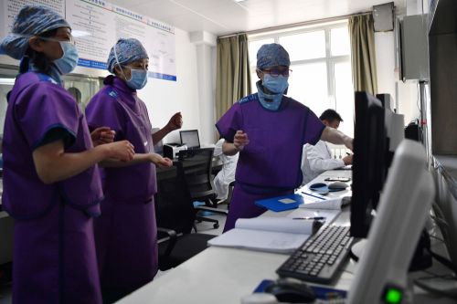 3月7日,马娜(左一)和同事交流患者病情。新华社记者 陈斌 摄