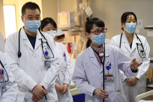 3月6日,马娜(右二)和同事在病房内查房。新华社记者 陈斌 摄