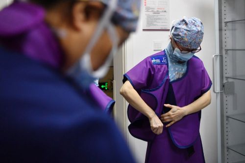 3月6日,马娜(右)和同事穿上铅衣准备手术。新华社记者 陈斌 摄