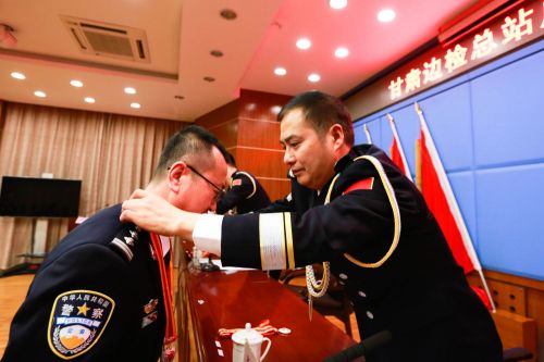 甘肃边检总站郑兆华总站长为民警颁发纪念章。