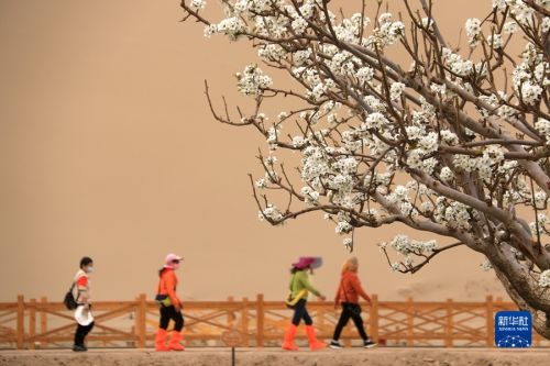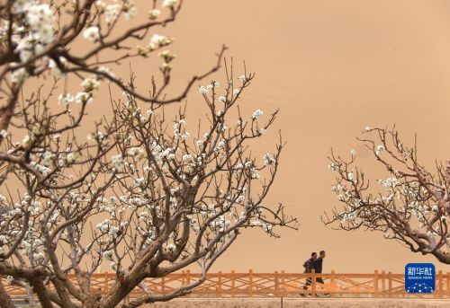 近日,甘肃省敦煌市鸣沙山月牙泉景区内的桃花、梨花、丁香花竞相绽放,别有一番韵味。