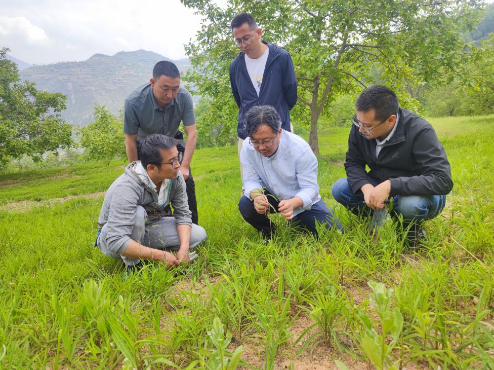 王若愚(前中)和同事在甘肃省陇西县首阳镇禄家门村中药材大田里查看道地药材长势情况(5月20日摄)。新华社发
