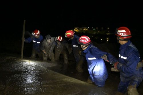 夜晚漆黑一片,强降雨仍在持续。村里的排洪渠已被阻塞,大量沙石泥水向四处涌来。搜救人员手拉手趟过泥水,每走一步都得用尽全身力气。在经过艰难跋涉后,他们终于将被困在工棚中的多名工人陆续营救出来,其中7人受伤。另有2人遇难、2人失联,搜救人员又投入到寻找失联人员的工作中。