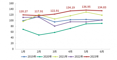 2019-2023年上半年甘肃乡村旅游消费热度指数走势(点)