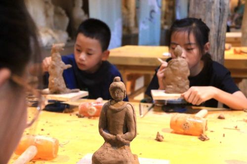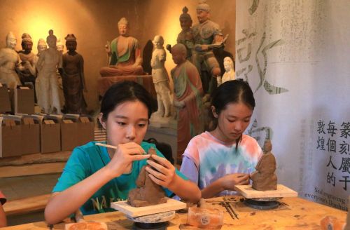 7月26日,在甘肃省敦煌市莫高里工匠村研学课堂,孩子们学习制作木胎泥塑。新华社发(张晓亮摄)