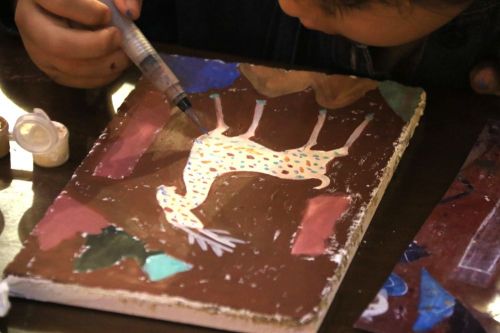 7月26日,小朋友在甘肃省敦煌书局研学课堂上学习绘制泥板画。新华社发(张晓亮摄)