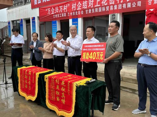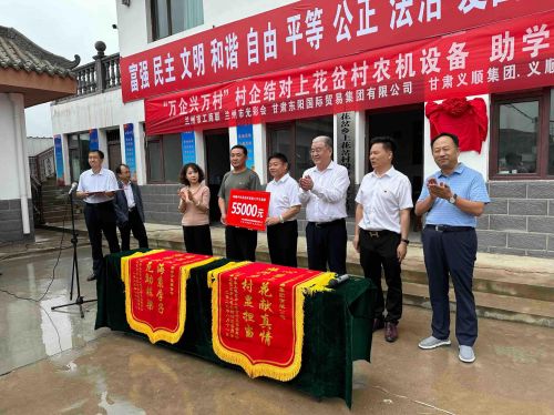 中国甘肃网8月12日讯 8月11日,兰州市工商联、兰州市光彩事业促进会携会员企业甘肃东阳国际贸易集团有限公司、甘肃义顺集团在榆中县上花岔乡上花岔村举行了“万企兴万村”兰州行动农机设备捐助及助学兴教捐赠活动,并在上花岔村举行了村企结对兴村示范点揭牌仪式。