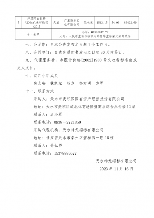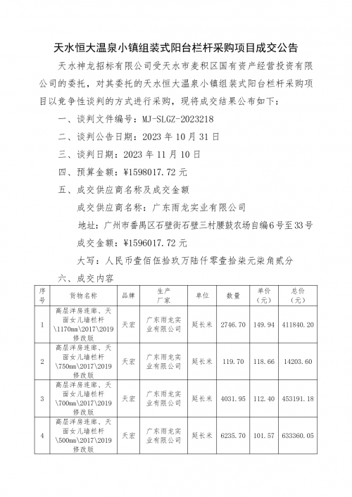 天水恒大温泉小镇组装式阳台栏杆采购项目成交公告