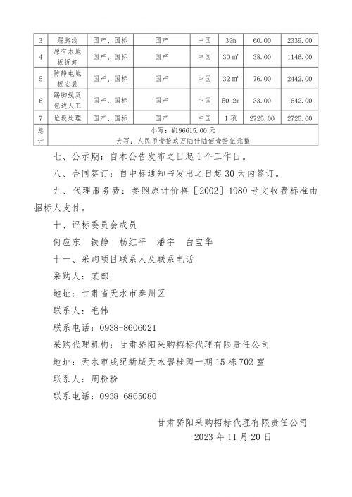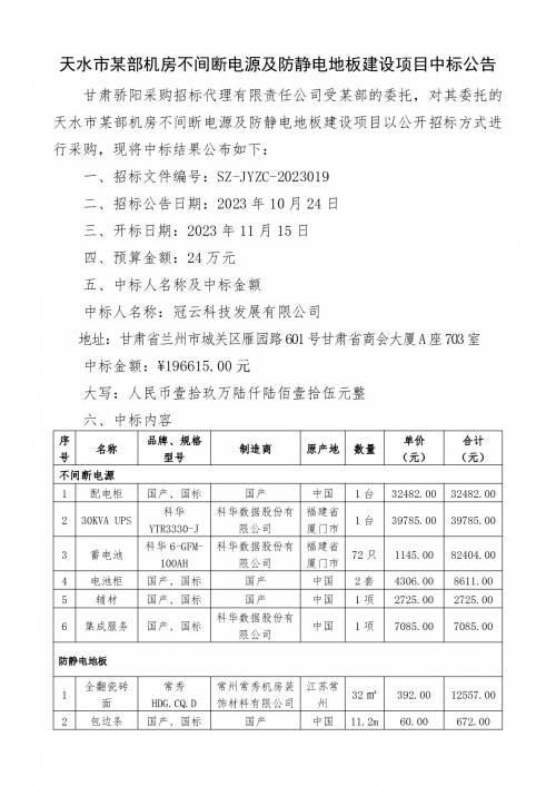 天水市某部机房不间断电源及防静电地板建设项目中标公告