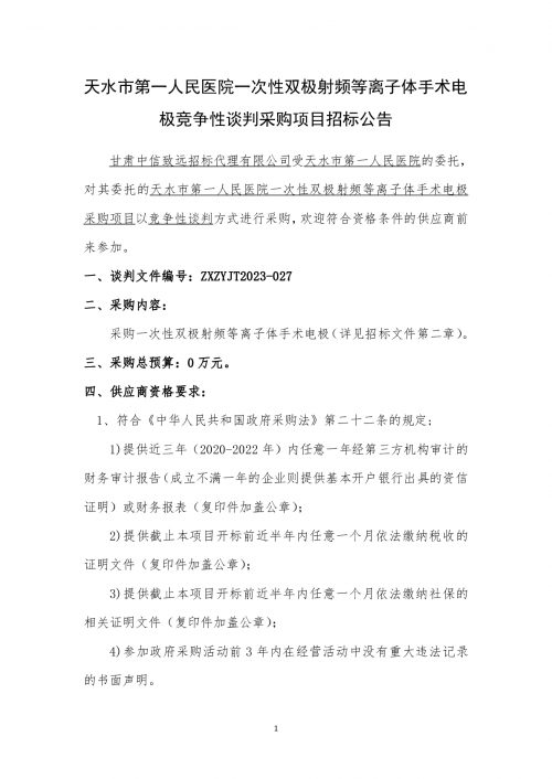 天水市第一人民医院一次性双极射频等离子体手术电极竞争性谈判采购项目招标公告