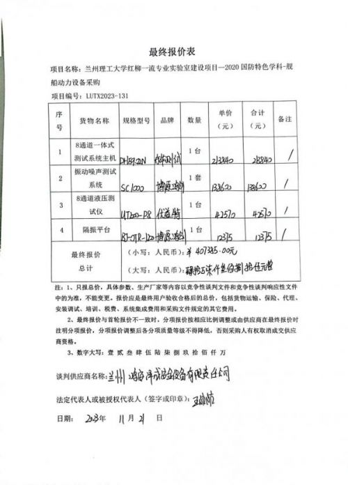 甘肃恒亿招标有限公司受兰州理工大学的委托,对“兰州理工大学红柳一流专业实验室建设项目—2020国防特色学科-舰船动力设备采购”以竞争性谈判方式进行采购。谈判小组于2023年11月21日确定评审结果。现将评审结果公示如下: