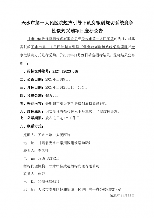 天水市第一人民医院超声引导下乳房微创旋切系统竞争性谈判采购项目废标公告