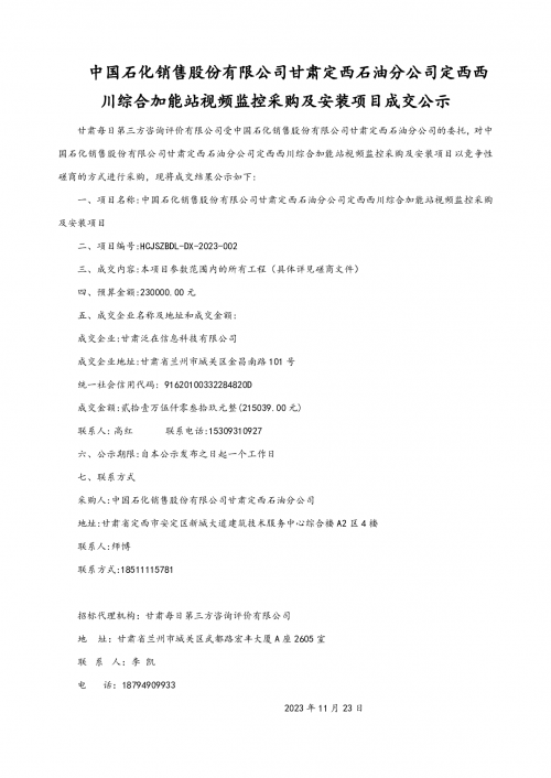 中国石化销售股份有限公司甘肃定西石油分公司定西西川综合加能站视频监控采购及安装项目成交公示