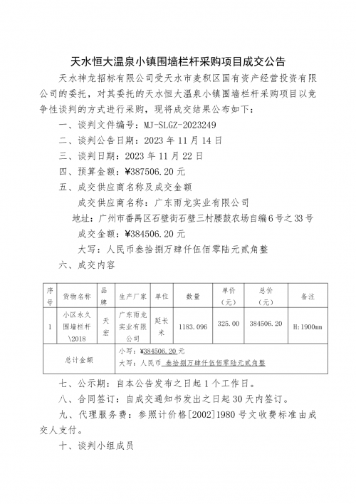 天水恒大温泉小镇围墙栏杆采购项目成交公告