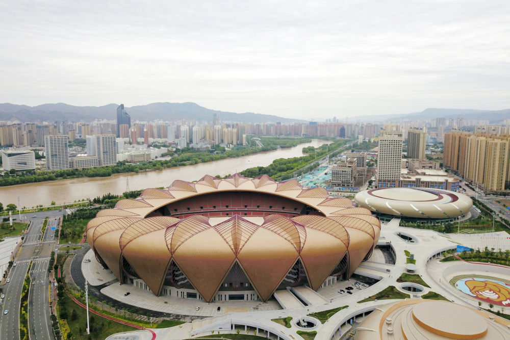 这是在兰州市七里河区拍摄黄河沿岸的兰州奥体中心(无人机照片)。新华每日电讯记者 范培珅 摄