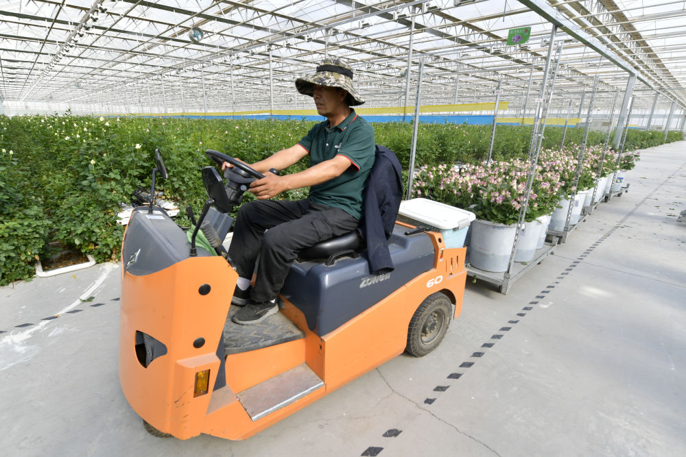 在兰州新区现代农业示范园花卉产业基地,工人使用转运车转运采摘的玫瑰(8月1日 摄)。新华每日电讯记者 范培珅 摄