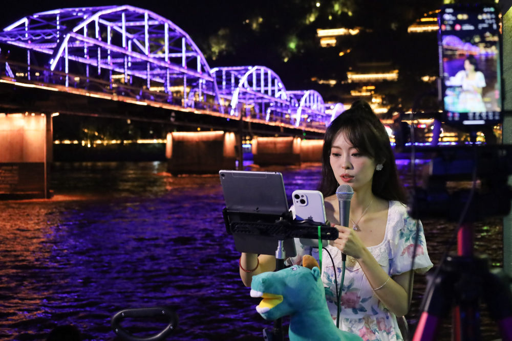 7月27日,主播在黄河兰州段中山桥附近直播。新华每日电讯记者 马希平 摄