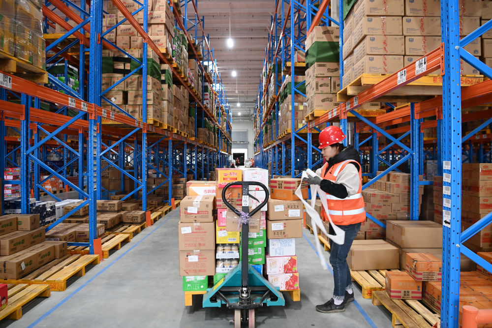 在兰州市皋兰县丰恩皋兰现代物流园,工作人员转运物品(11月12日 摄)。新华每日电讯记者 范培珅 摄