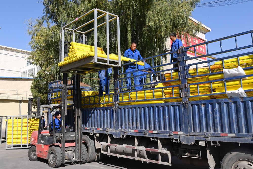 在兰州市榆中县一家塑料制品有限公司,工人往货车上装运地膜(10月28日 摄)。新华每日电讯记者 范培珅 摄
