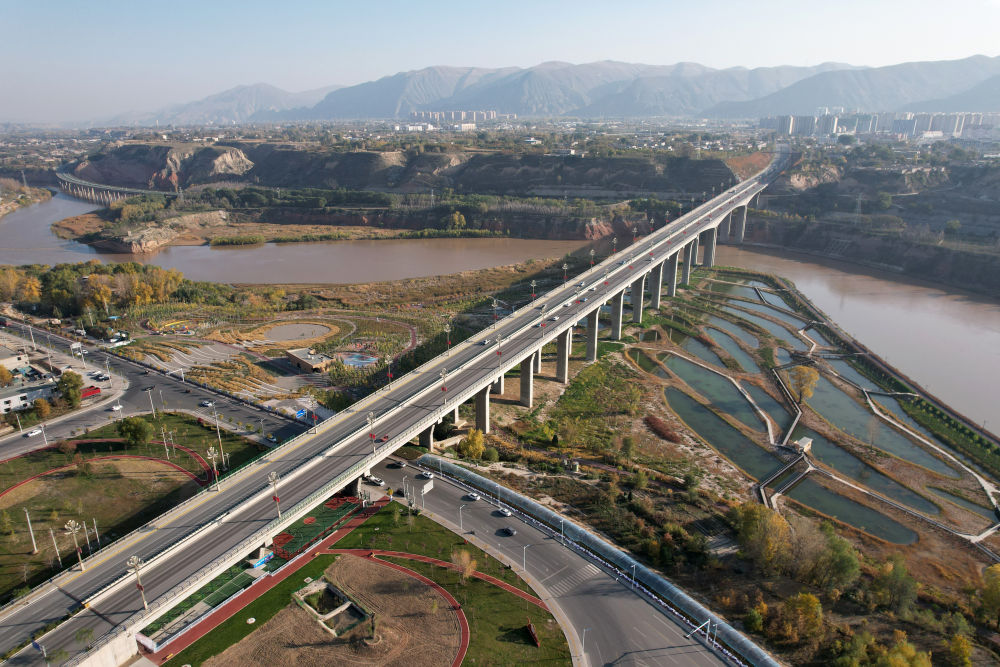 这是10月28日在兰州市红古区拍摄的连接青海与甘肃的川海大桥(无人机照片)。新华每日电讯记者 范培珅 摄