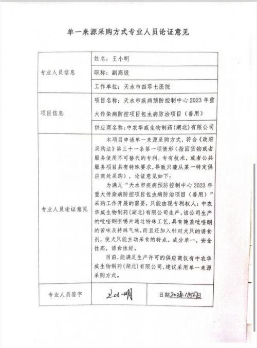 采用单一来源采购方式的原因及说明:2016年4月7日,农业部公告第2388号批准吡喹酮咀嚼片为五类新兽药,研制单位中仅中农华威制药(湖北)有限公司1家单位具备生产条件,并于2021年换发了兽药产品批准文号(兽药字010012904),天水市疾病预防控制中心2023年重大传染病防控项目包虫病防治项目(兽用)是由中农华威生物制药(湖北)有限公司生产的吡喹酮咀嚼片因相关专利、专有技术原因,所有厂家均不开放。符合《政府采购法》第三十一条第三项规定,采用单一来源方式采购。鉴于上述原因,拟对本项目采用单一来源采购方式选择中农华威生物制药(湖北)有限公司承担本次项目的工作。