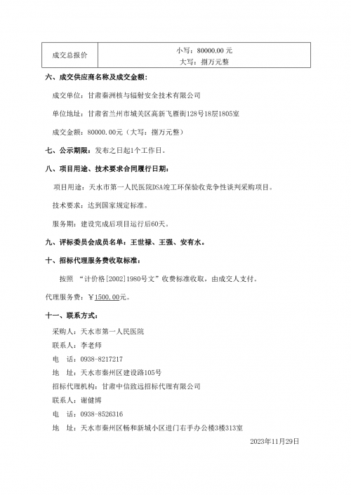 天水市第一人民医院DSA竣工环保验收竞争性谈判采购项目成交公告