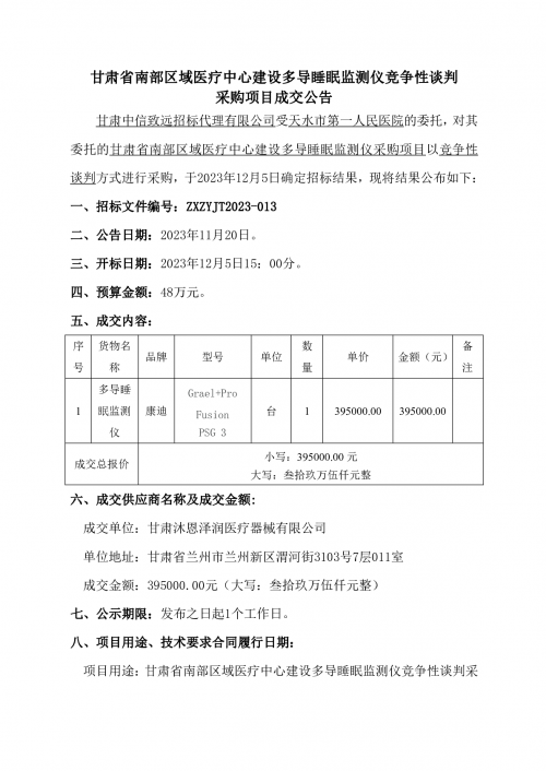 甘肃省南部区域医疗中心建设多导睡眠监测仪竞争性谈判采购项目成交公告