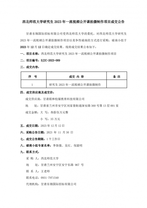 西北师范大学研究生2023年一流视频公开课拍摄制作项目成交公告
