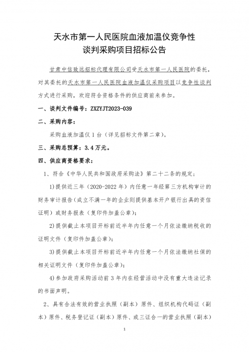 天水市第一人民医院血液加温仪竞争性谈判采购项目招标公告
